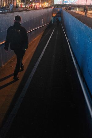 A man heads down the subway tunnel towards Waterloo